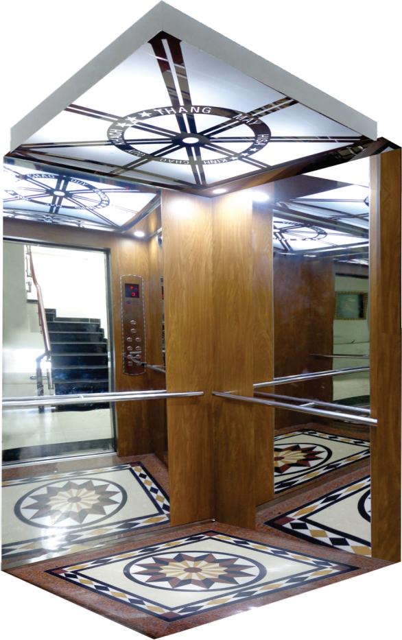 Chi tiết: Thang máy tải khách thiết kế đơn giản với inox gương và vật liệu laminate bền tốt. Trang trí nội thất thang máy, trần giả thiết kế theo yêu cầu, sàn đá granite hoa văn.