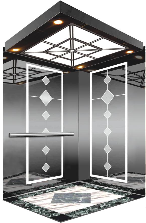 Chi tiết: Thang máy tải khách thiết kế hiện đại vách inox gương. Nội thất thang máy với trang trí họa tiết, trần giả chiếu sáng, sàn đá granite cao cấp.